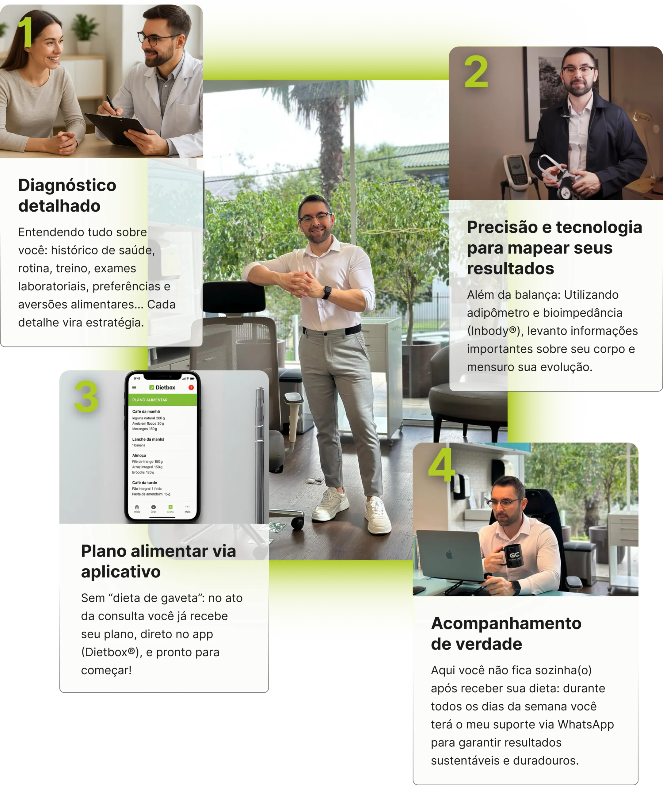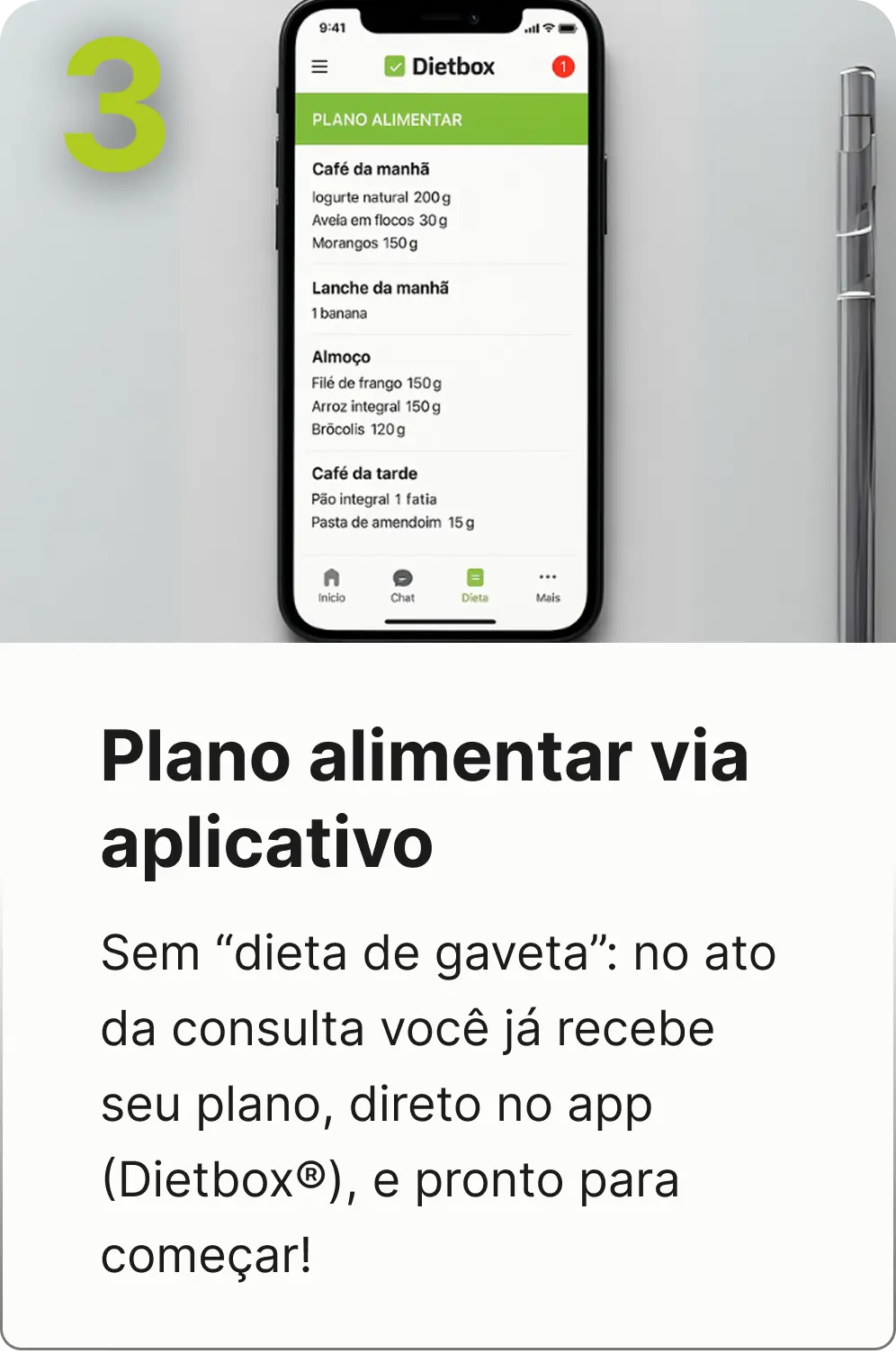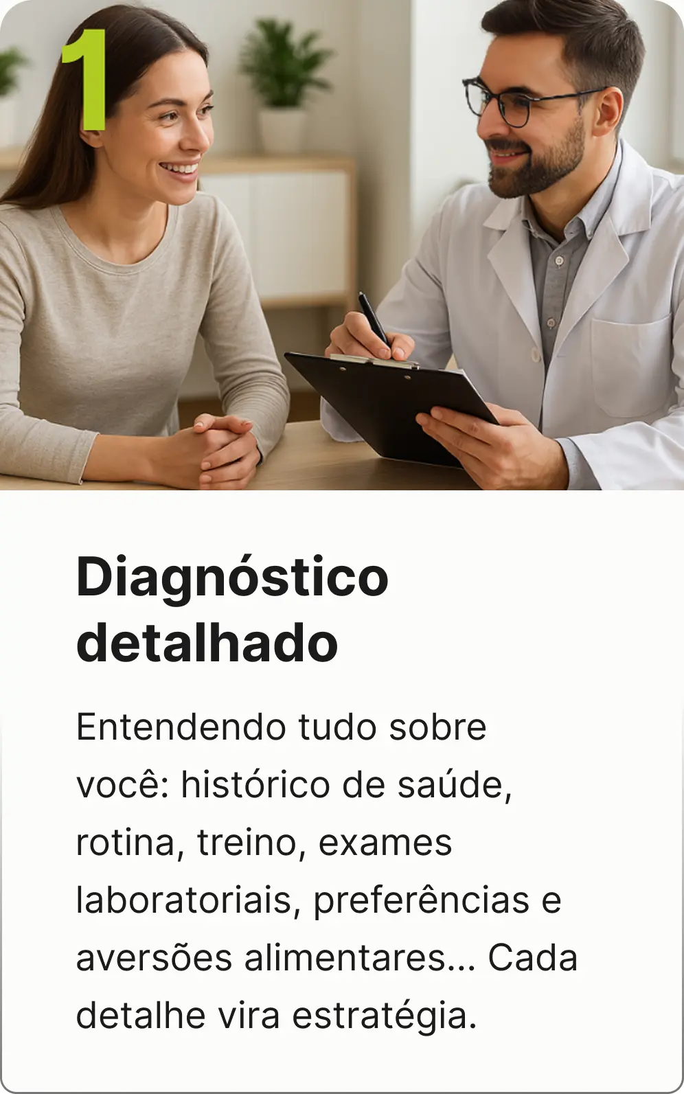 Já tentou muitas estratégias, cortou vários alimentos, emagreceu, mas logo voltou a engordar? Isso acontece porque dietas prontas e cheias de restrições não funcionam a longo prazo. Aqui, seu plano alimentar é feito especialmente para você, de forma personalizada, flexível e fácil de seguir no dia a dia.